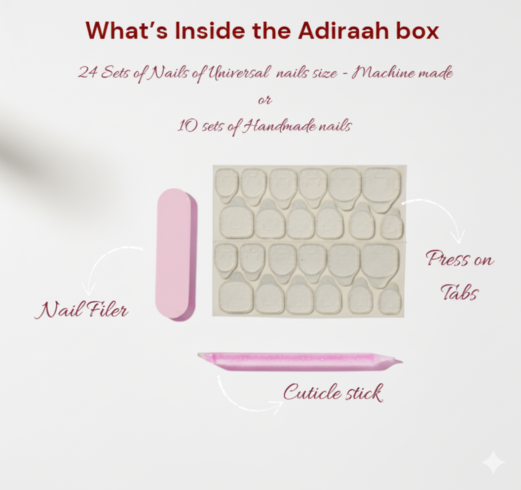 At Adiraah, beauty is more than just looks — it’s about expression, confidence, and convenience. Every nail set is carefully crafted to make you feel stylish, empowered, and unapologetically you.