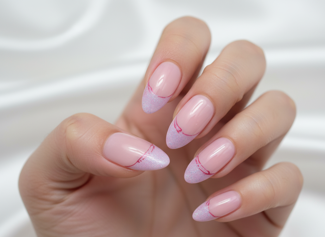 Illuminate your fingertips with French Noor, luxe almond-shaped press-ons featuring a blush nude base, lavender-glitter French tips, and delicate Pink accents. Elegant yet modern, they’re perfect for brides-to-be, evening Party, or anyone who loves timeless glam with a sparkling twist.