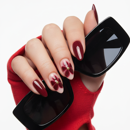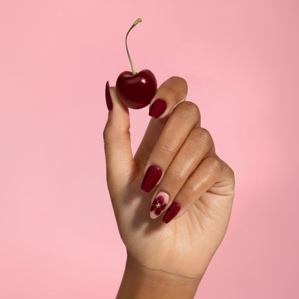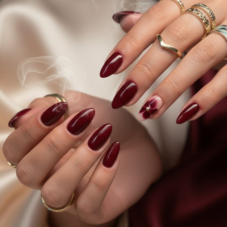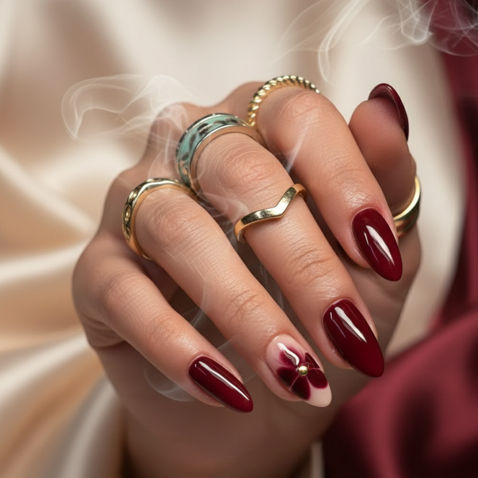 Turn every gesture into a statement with Gulab-e-Noor, our luxurious almond-shaped press-on nails that blend passion and elegance. Painted in a deep velvety rose-red, this set features a stunning accent nail with painted floral artistry and a golden stud at the center—symbolizing beauty, strength, and timeless love.