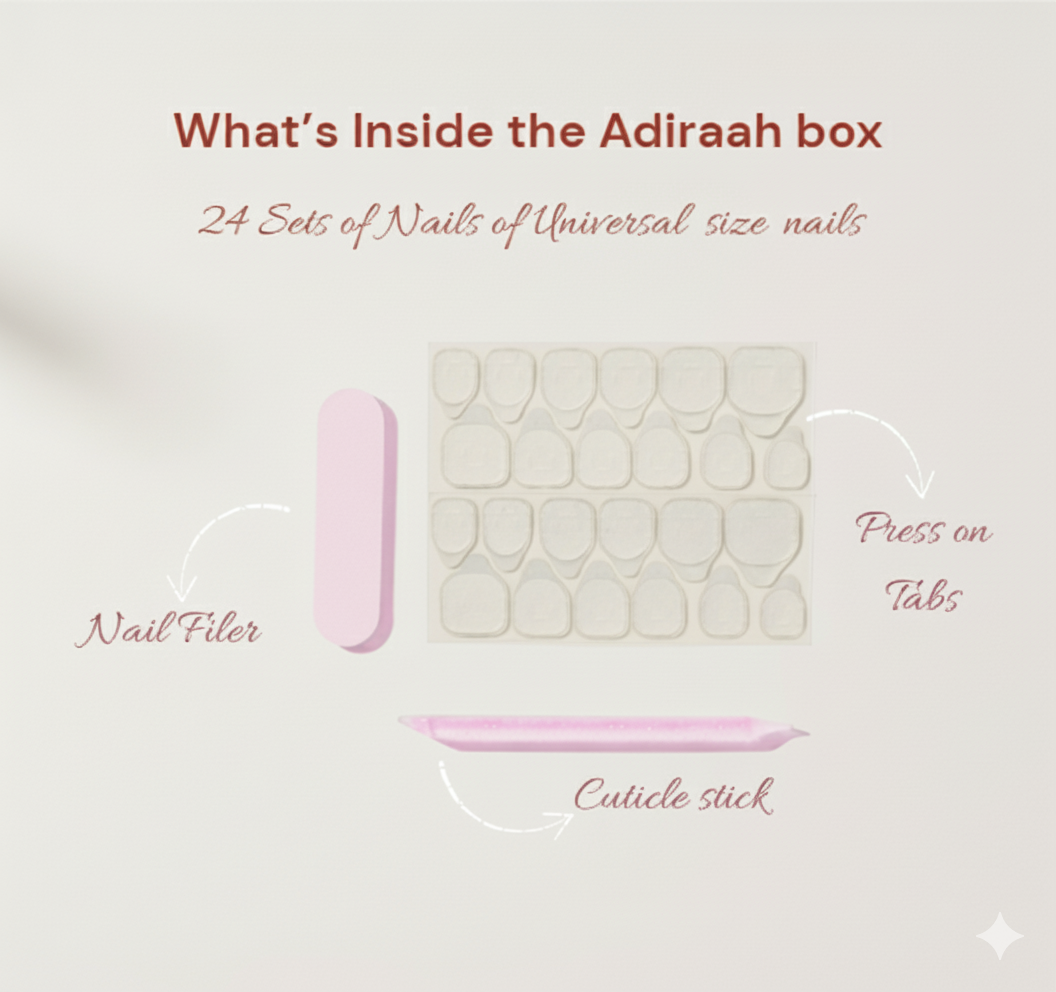 - Each Adiraah Nail Kit → 24 nails in universal sizes.