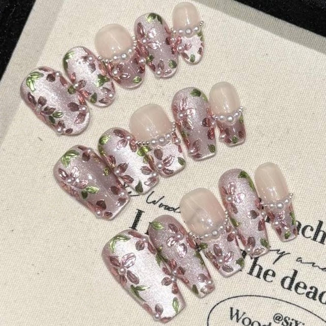 Turn every moment into a floral fantasy with handmade Gulabi Glam, that capture the essence of feminine grace. Adorned with soft pink shimmer, intricate hand-painted floral detailing, and dainty pearl embellishments, this set brings together tradition and trend in the most delicate way. Whether you’re dressing up for a wedding, a festive soirée, or just want to add a romantic touch to your everyday look, Gulabi Glam nails are your go-to for a graceful, salon-perfect finish—minus the fuss.
